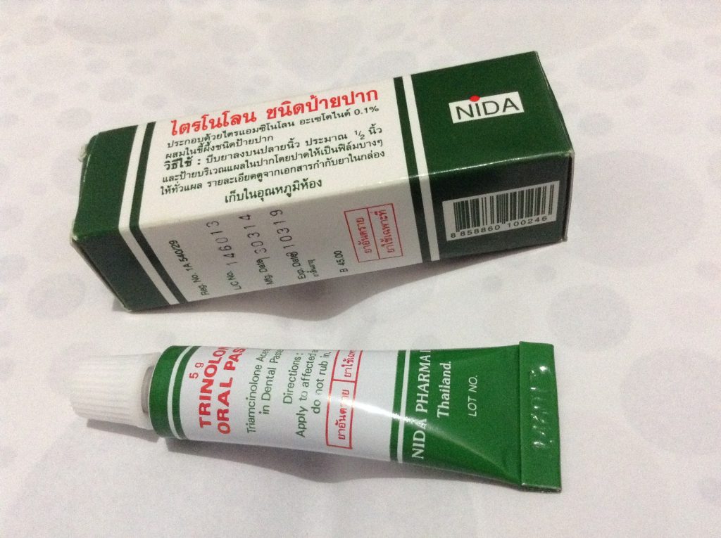 10. ยาป้ายสำหรับแผลร้อนในหรืออักเสบในปาก เช่น ไตรโนโลน ออรัลเพสท์ (ไตรนาล็อก) อันนี้มีส่วนผสมของสเตียรอยด์ ถ้าใครกังวลเรื่องนี้มากปรึกษาหมอก่อนใช้ก็ดีครับ อย่างผมปกติใช้น้อยมาก (ปกติใช้ไม่กี่วันแผลก็หายแล้ว) เลยไม่ค่อยซีเรียสเท่าไหร่ครับ