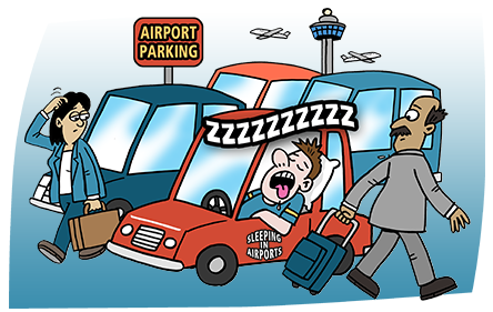 ไม่ว่าคุณจะตั้งใจไปนอนสนามบินเอง หรือเกิดเหตุให้ต้องติดอยู่ที่สนามบินข้ามคืน มีโอกาสที่คุณจะทนสภาพแวดล้อมในสนามบินไม่ได้ แต่จะไปเปิดห้องโรงแรมนอนก็ไม่มีเงินพอ เคล็ดลับประการหนึ่งคือ เดินไปหาบริษัทเช่ารถ ดูราคาเทียบกับค่าโรงแรม ถ้าถูกกว่าอย่างมีนัยสำคัญแล้วละก็ ติดต่อเช่ารถมาคันนึง แล้วก็นอนมันในรถนั่นแหละ ข้อดีคือจะไม่มีใครมาวุ่นวายกับคุณ ไม่มีเสียงหนวกหู ไม่มีเจ้าหน้าที่รักษาความปลอดภัยมาไล่ ไม่ต้องกลัวของหาย อาจจะห่างห้องน้ำบ้าง แต่อย่างน้อยคุณก็สามารถจะปรับเบาะเอนนอนได้อย่างสบายใจ แนะนำให้ ดูเรื่องเวลาส่งรถคืนด้วย เพราะถ้าเครื่องบินเราออกเช้ามากๆ บริษัทรถยนต์อาจจะยังไม่มีเจ้าหน้าที่มารับรถคืน