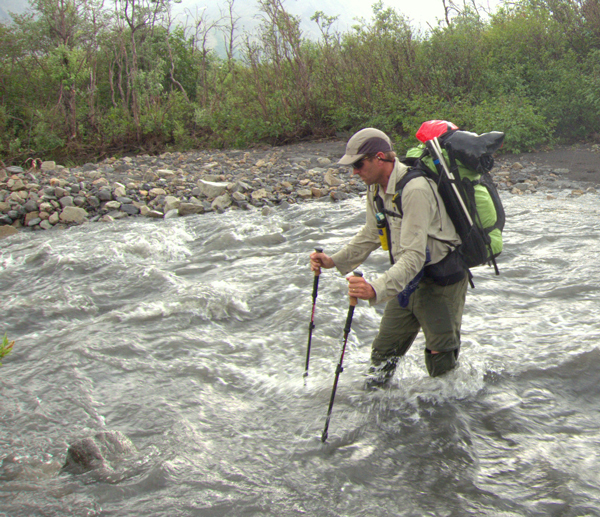 - ข้ามลำธารหรือแม่น้ำ ซึ่งเป็นการเดินที่ต้องต่อสู้กับความแรงของน้ำ และความลื่นของพื้น ไม้เท้าเดินป่าจะช่วยในการรักษาสมดุล ลักษณะการเดินที่ดีคือ พยายามให้มีจุดสัมผัสพื้น 3 จุด ก็คือ เท้า 1 ข้าง ไม้เท้า 2 อัน จะสัมผัสพื้นไว้ ในขณะที่เราก้าวขาอีกข้างไปข้างหน้า โดยต้องมั่นใจว่าไม้เท้าที่สัมผัสพื้นมีความมั่นคงในระดับนึงก่อนจึงค่อยก้าวเท้าออกไป ในกรณีที่น้ำลึกมากให้ยืดความยาวไม้เท้าเผื่อไว้ ถ้าเป็นจุดที่มองไม่เห็นระดับความลึกก็ให้ลองเอาไม้เท้าหยั่งดูระดับความลึกก่อนก้าว