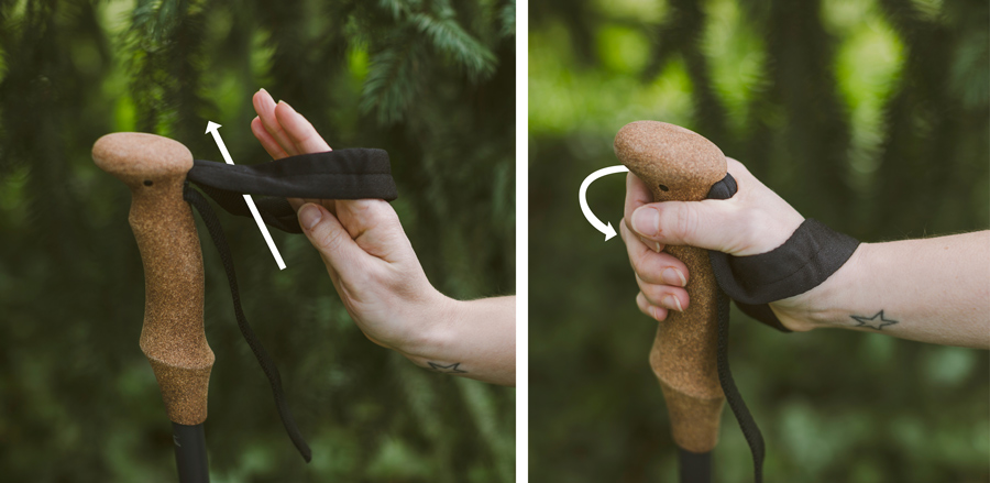 จุดสำคัญของท่าจับจะอยู่ที่สายคล้องข้อมือ (Wrist Strap) ซึ่งสมัยก่อนผมก็สงสัยมากว่าจะคล้องไปทำไม มารู้เอาที่หลังเมื่อผ่านไปหลายปีแล้วว่า สายคล้องข้อมือจะช่วยรองรับข้อมือ หรือส้นมือ ให้สามารถเดินได้โดยผ่อนคลายที่มือ ถ้าใช้อย่างถูกต้อง จะปล่อยไม้เท้า ไปหยิบจับอะไรได้สะดวก โดยไม่ต้องห่วงว่าไม้เท้าจะหลุดมือเลย เช่น การถ่ายรูป หรือ การกินอาหารเพิ่มพลังระหว่างเดิน ซึ่งสายรัดพวกนี้มีหลายรุ่นที่สามารถปรับระยะสายให้เหมาะกับระยะข้อมือแต่ละคนได้