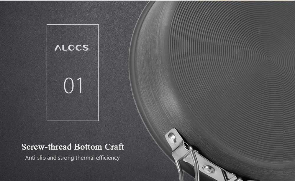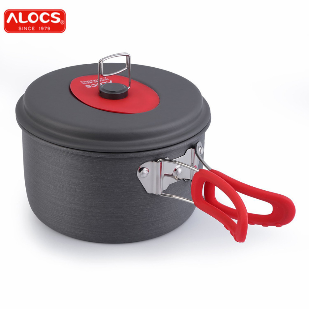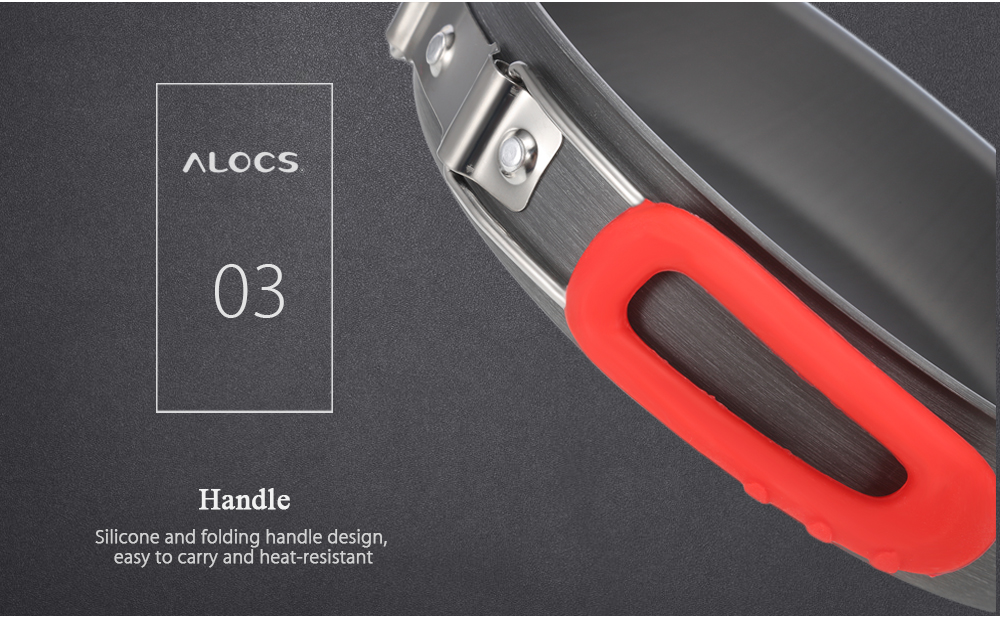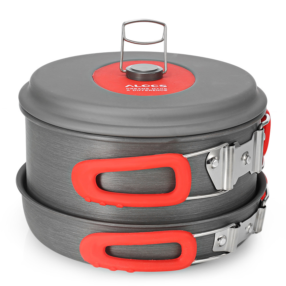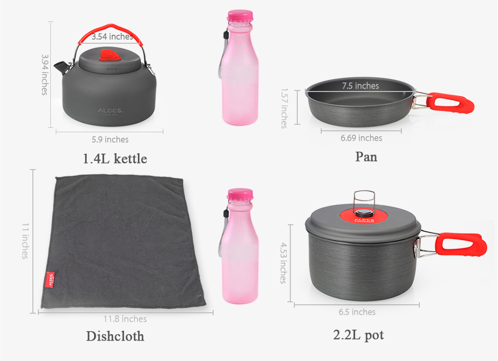 ชุดเครื่องครัวสำหรับปิคนิค ALOCS ขนาดสำหรับ 2-3 คน ให้คุณพร้อมสำหรับการตั้งแคมป์ทำอาหารด้วย หม้อขนาด 2.2 ลิตร กระทะขนาด 7.5 นิ้ว พร้อมกาน้ำขนาด 1.4L และผ้าเช็ดทำความสะอาด พื้นกระทะออกแบบเป็นวงหอยช่วยในการถ่ายเทความร้อนให้ดียิ่งขึ้น วัสดุที่ใช้ในการผลิตทำจาก Hard-anodized aluminum ที่แข็งแรงทนทาน สามารถทนรอยขีดข่วน และการสึกกร่อนได้เป็นอย่างดี ด้ามจับแข็งแรงทำจากวัสดุซิลิโคนเกรดสำหรับทำอาหารโดยเฉพาะ การออกแบบที่ช่วยให้เครื่องครัวทั้งหมดวางซ้อนกันได้ เพื่อให้เก็บได้ขนาดเล็ก ไม่เปลืองเนื้อที่ในการเดินทาง
