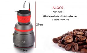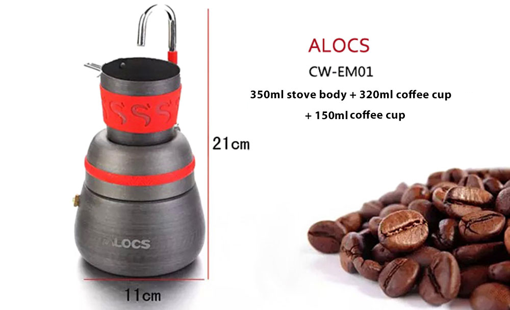 หม้อต้มกาแฟ Alocs ผลิตจาก Aluminium Alloy เคลือบแข็ง ให้ความแข็งแรงทนทานสูง ทนต่อการขูดขีด ทำความสะอาดง่าย สามารถถ่ายเทความร้อนได้ดี ในชุดประกอบด้วยหม้อต้มกาแฟขนาด 350 ml และแก้ว 2 ใบขนาด ใบละ 320 ml และ 150 ml ออกแบบมาให้มีขนาดเล็กและน้ำหนักเบา เหมาะสำหรับพกพาไปดื่มกาแฟโปรดได้ทุกที่