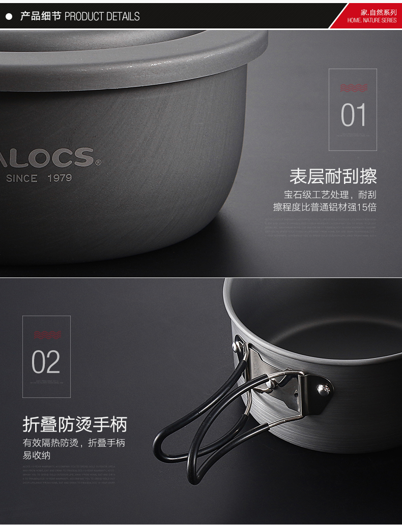 ชุดเครื่องครัวสำหรับเดินทาง 1-2 คน แบบเตาแอลกอฮอล์จาก ALOCS รุ่น CW-C01 ในชุดจะประกอบด้วย 7 ชิ้นส่วน คือ ส่วนหม้อขนาด 0.9 ลิตร ถ้วยขนา 450 ml นอกจากนั้นยังประกอบด้วยชุดเตาแอลกอฮอล์ Spirit Burner พร้อมฉากกันลมและฐานเตา และผ้าเช็ด รวมทั้งหมด 7 ชิ้นส่วน ผลิตจากวัสุดคุณภาพเกรดสำหรับอาหารโดยเฉพาะ hard-anodized aluminum ที่เบาและแข็งแรงทนทาน ด้ามจับทำจากซิลิโคนช่วยป้องกันความร้อนขณะจับ ด้วยขนาดที่เล็กกระทัดรัด ทำให้ช่วยประหยัดเนื้อที่ในการเดินทางได้ ฝาครอบมี O Ring ช่วยป้องกันแอลกอฮอล์ระเหย ทำให้สามารถเก็บแอลกอฮอล์ทีี่เหลือได้