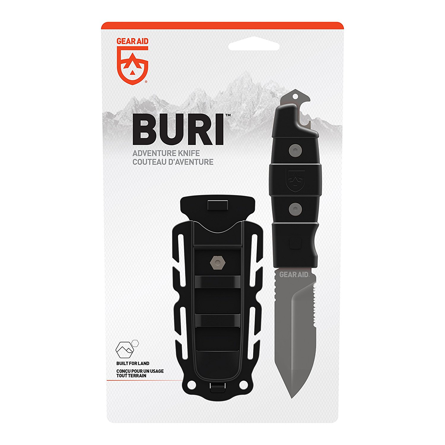 มีดเดินป่า Gear Aid รุ่น ฺBuri เป็นรุ่นมีดที่ออกแบบสำหรับการทำกิจกรรมกลางแจ้ง เดินป่า แค้มปิ้ง ปีนเขา ขนาดพกพาเล็ก น้ำหนักเบาเพียง 102g (ไม่รวมฝัก) ในขณะที่ค่วามสามารถในการตัดไม่เล็กตามไปด้วย ใช้เป็นมีดอเนกประสงค์ได้ทั้ง ตัดเชือก หั่นวัตถุดิบในการทำอาหาร ทุบกระจก หรือแม้แต่เปิดขวด ลักษณะมีดเป็นโลหะชิ้นเดียวยาวไปจนถึงด้ามจับ จึงมีความแข็งแรงสูง ไม่แตกหักง่าย สามารถห้อย เหน็บหรือแขวนได้หลายรูปแบบ ทั้งติดเป้
