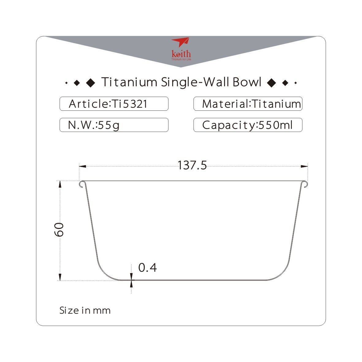 ถ้วยชามไทเทเนียม จาก Keith ขนาด 550ml ผลิตจากโลหะไทเทเนียม น้ำหนักเบา เหมาะสำหรับเป็นอุปกรณ์พกพาสำหรับรับประทานอาหารระหว่างการเดินทาง