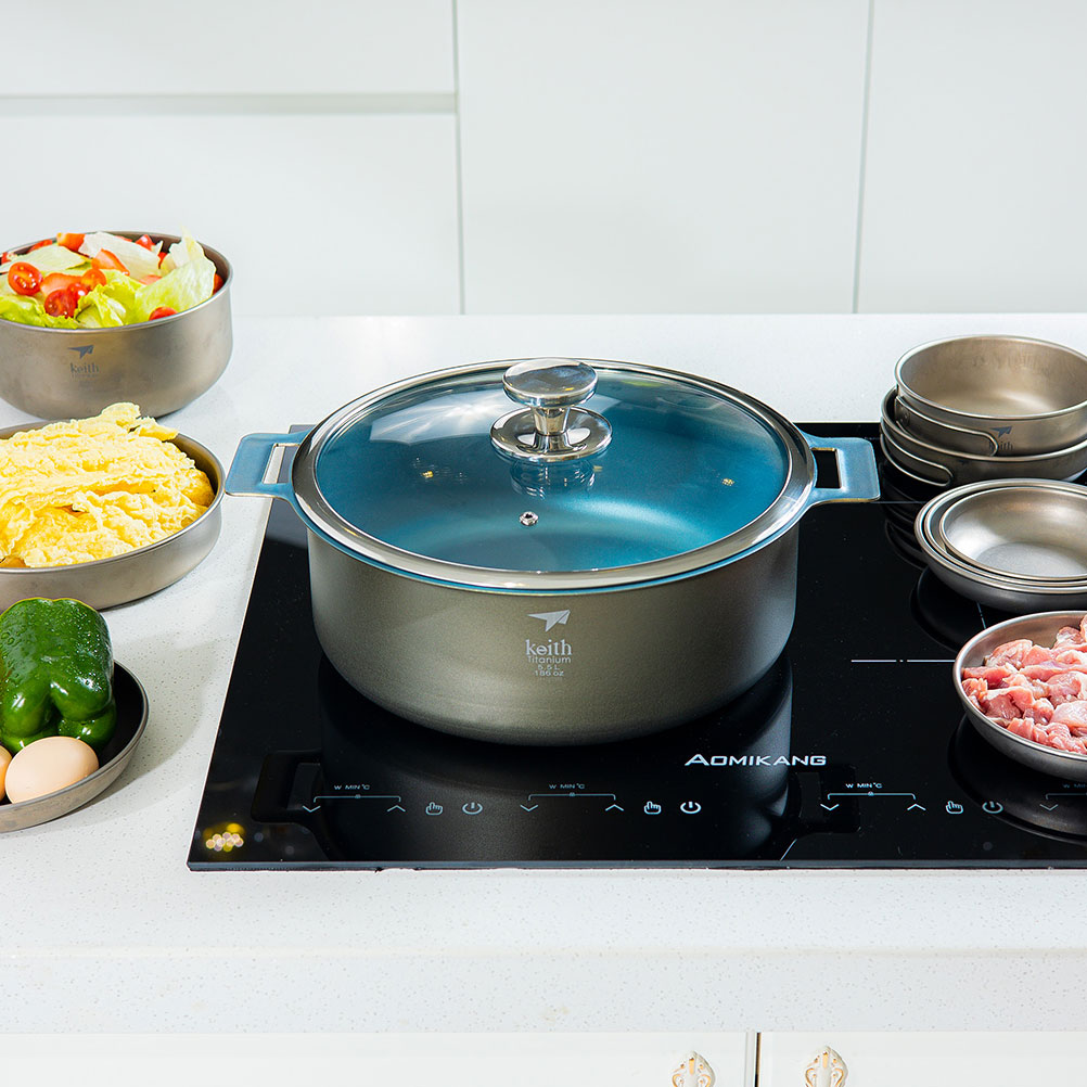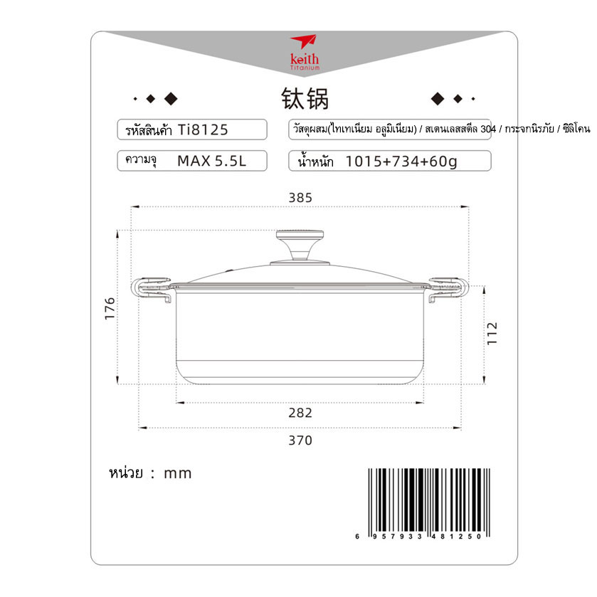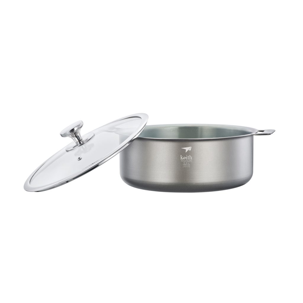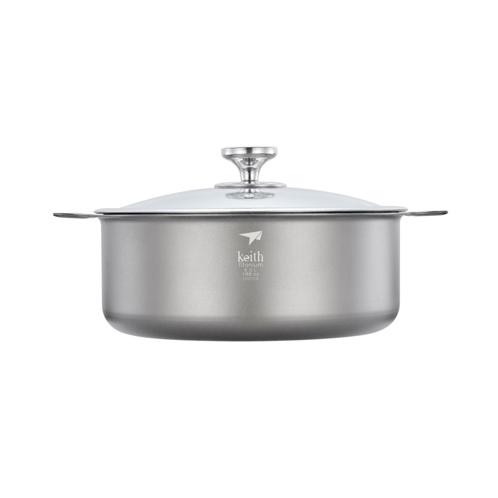หม้อวัสดุผสม ขนาด 5.5 ลิตร รุ่น Ti8125 จาก Keith ผลิตจาก วัสดุคอมโพสิตอะลูมิเนียมไทเทเนียม ทนทานต่อกรด-ด่างและการกัดกร่อนได้ดีเยี่ยม ทนสนิม การนำความร้อนที่ดี เนื่องจากวัสดุหม้อเป็นไทเทเนียมกับอลูมิเนียม มีการใช้สเตนเลสตีล แค่ส่วนน็อตยึดฝา จึงปลอดภัยจากสารนิกเกิลที่ผสมในสเตนเลส (สเตนเลสจะผสมนิกเกิลเพื่อป้องกันการเกิดสนิม) ผู้ใช้จึงมั่นใจได้ถึงความปลอดภัยของอาหาร ตัวหม้อมีโครงสร้างขึ้นรูปชิ้นเดียว ช่วยลดการสะสมของสิ่งสกปรกและทำความสะอาดง่าย ฝาเป็นกระจกนิรภัยความแข็งแรงสูง ด้ามจับหุ้มซิลิโคนกันความร้อน ตอบโจทย์ทุกความต้องการของครอบครัว