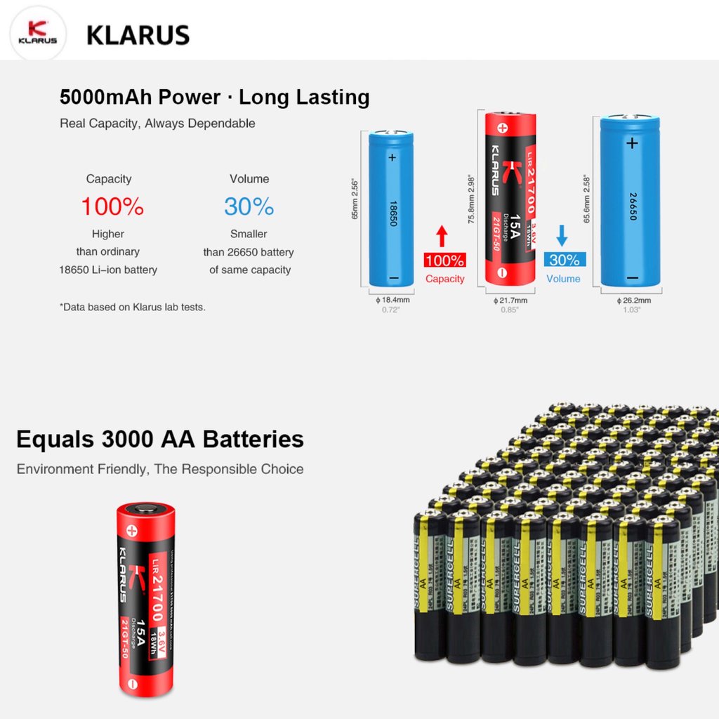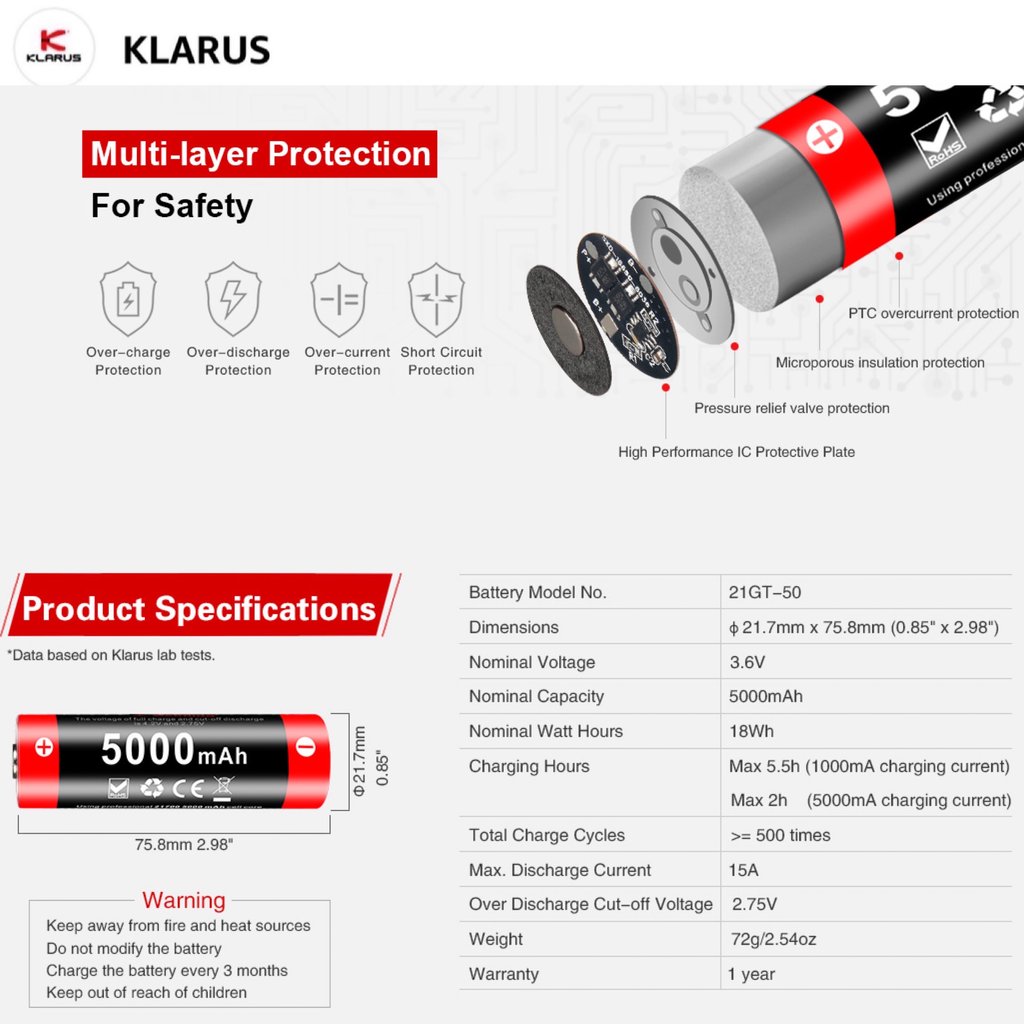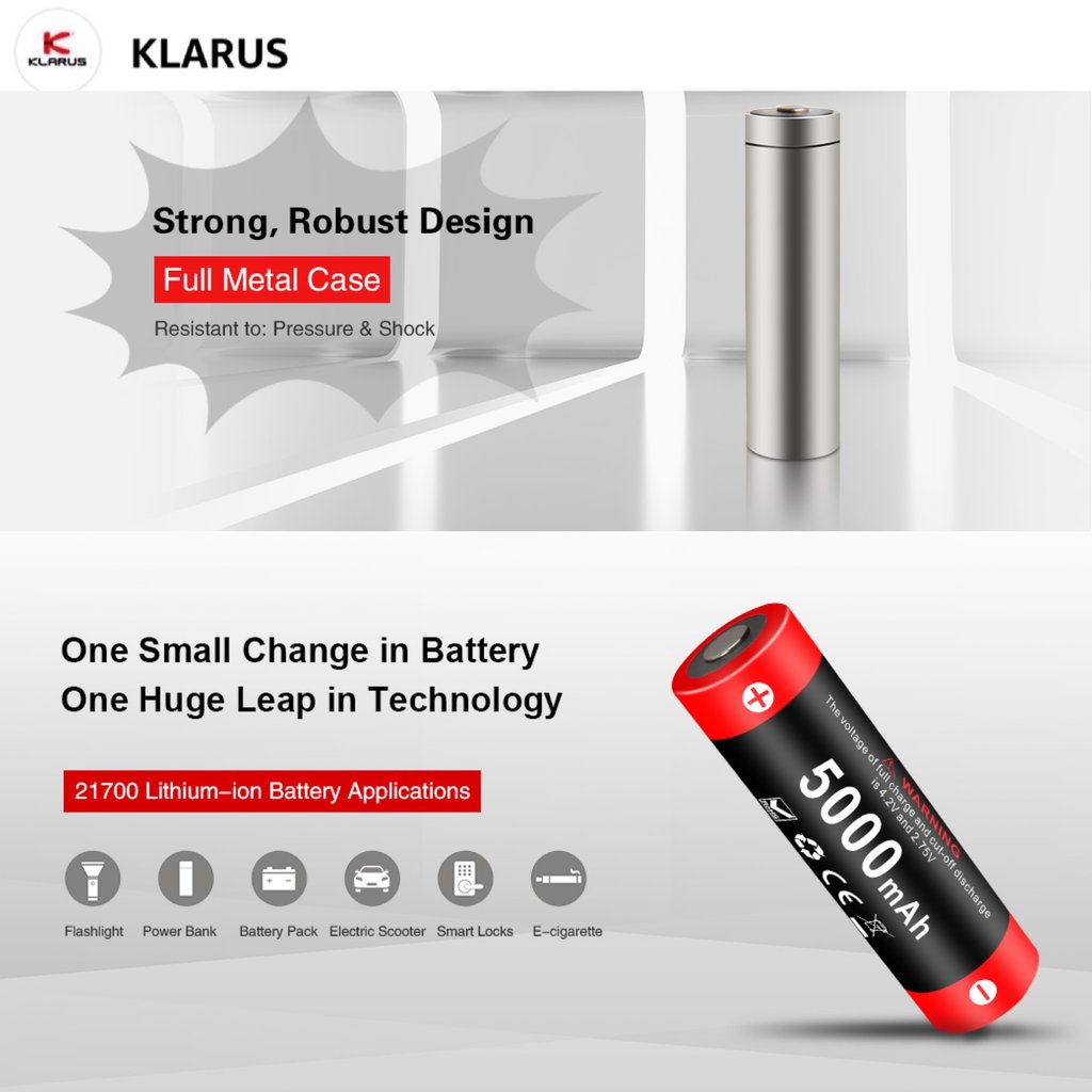 แบตเตอรี่ Klarus 21700  เป็นแบตเตอรี่ Li-ion คุณภาพสูง ความจุ 5000 mAh  มีแรงดันใช้งานที่ 3.6 V  พร้อมด้วยระบบป้องกันทางไฟฟ้า เช่น Over charge protection  , Over discharge Protection , Short Circuit Protection , Overheating Protection ชาร์จได้มากกว่า 500 ครั้ง