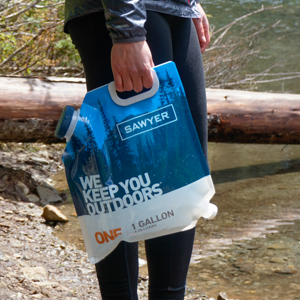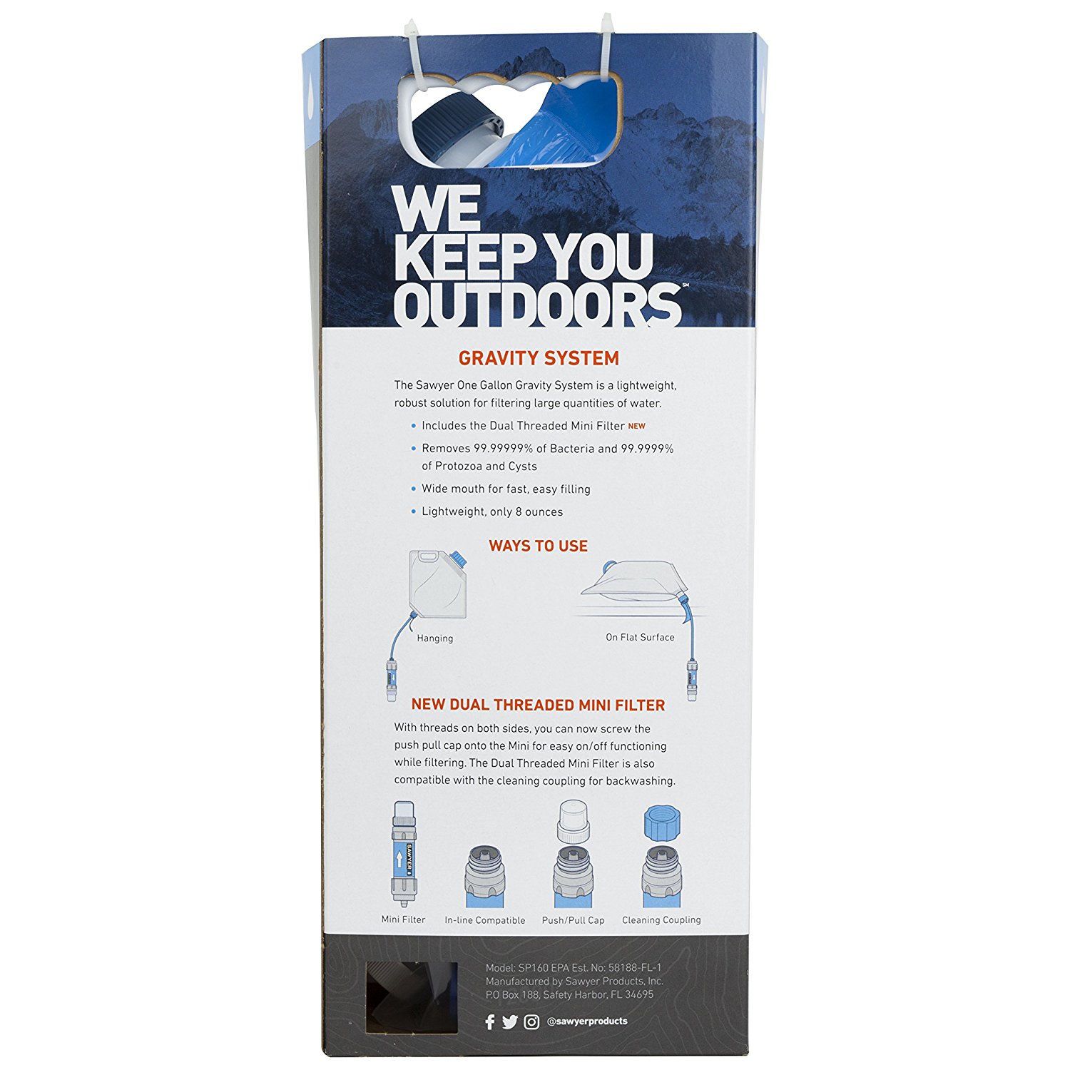เครื่องกรองน้ำ Sawyer 1 Gallon Gravity Water Filtration System ระบบเครื่องกรองน้ำน้ำหนักเบาสำหรับการกรองน้ำปริมาณมาก สามารถกรองน้ำปริมาณ 1 แกลลอน (3.78 ลิตร) ได้ในเวลาเพียงแค่ 7 นาที เครื่องกรองน้ำ Sawyer 1 แกลลอน ทำงานด้วยระบบแรงโน้มถ่วง โดยไม่ต้องใช้แรงปั๊ม หรือบีบ เพียงแค่แขวนไว้ แล้วให้แรงโน้มถ่วงทำหน้าที่ในการดันน้ำผ่านฟิลเตอร์ออกมา คุณก็จะได้น้ำสะอาดที่จะเป็นสำหรับการเดินทาง