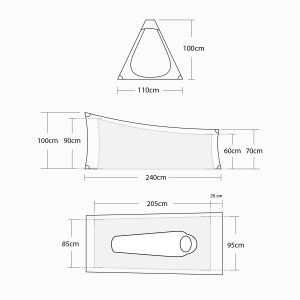 | วัสดุผ้า | ชั้นนอก: 30D ไนลอน 66 ริปสต็อป เคลือบซิลิโคน 2 ด้าน 2,000mm; ชั้นใน: 15D ไนลอน ตาข่าย พื้น: 30D ไนลอน 66 ริปสต็อป PU 3,000mm. |