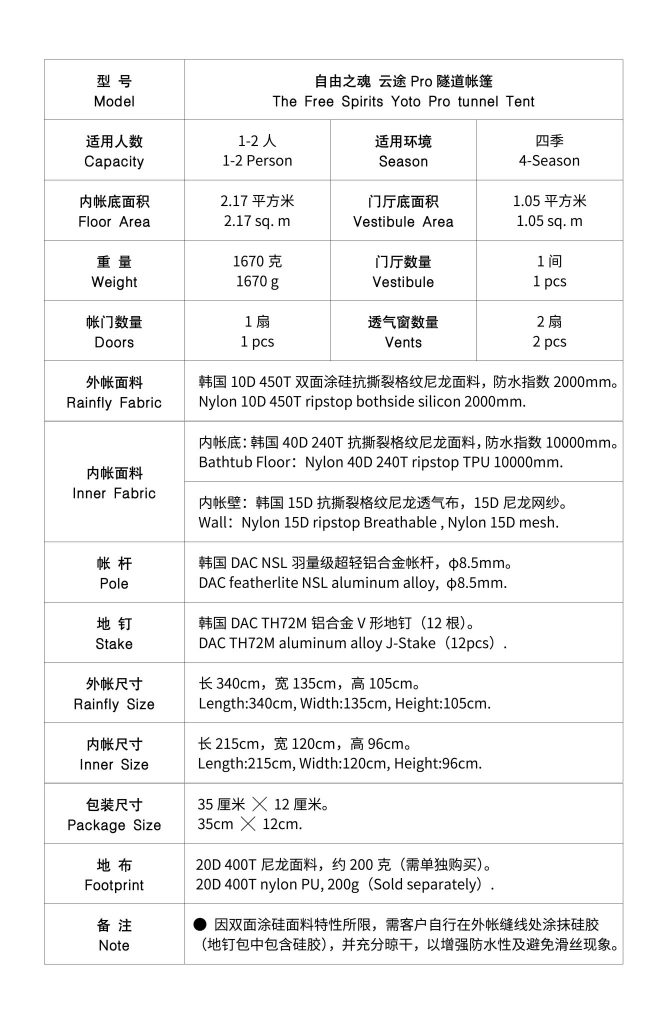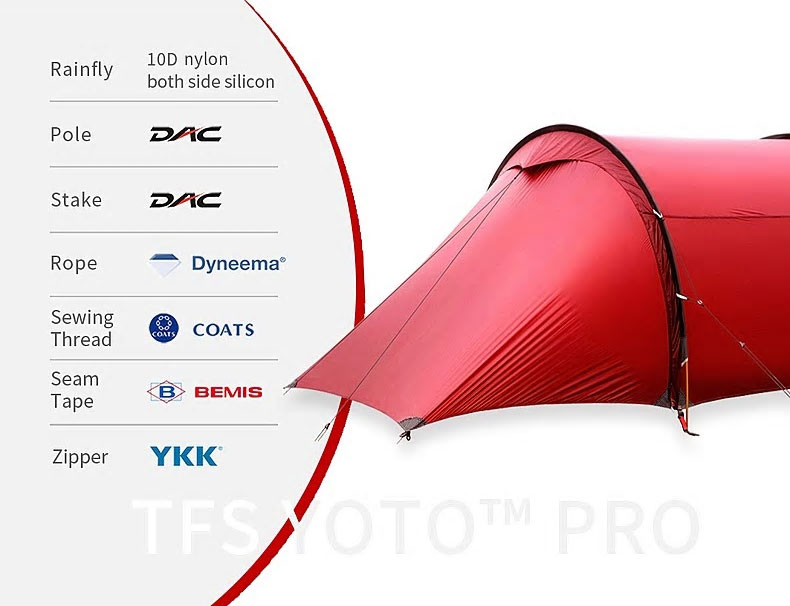 เต็นท์ 4 ฤดู รุ่น Yoto Pro จาก TFS เป็นเต็นท์ทรงอุโมงค์ขนาดนอน 2 คน ที่ออกแบบมาเพื่อรับสภาพอากาศที่เลวร้าย ไม่ว่าจะเป็นลมแรง หรือ หิมะตก ออกแบบให้มีขนาดพับเก็บที่เล็กและน้ำหนักเบากว่าเต็นท์ 4 ฤดูตัวอื่น นอกจากนั้นยังสามารถใช้งานได้หลากหลาย กางง่าย ใช้สมอเพียงแค่ 4 ตัวก็กางได้
