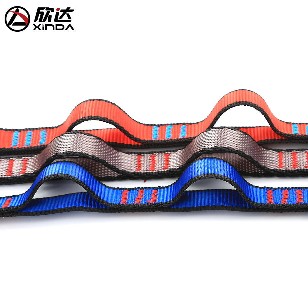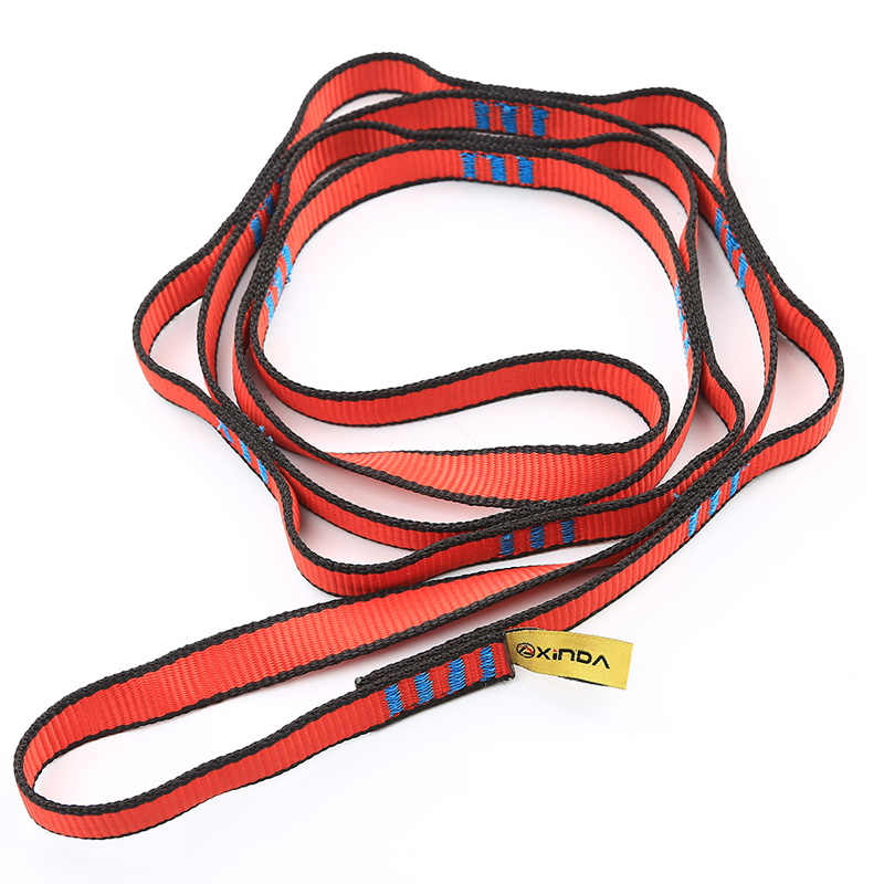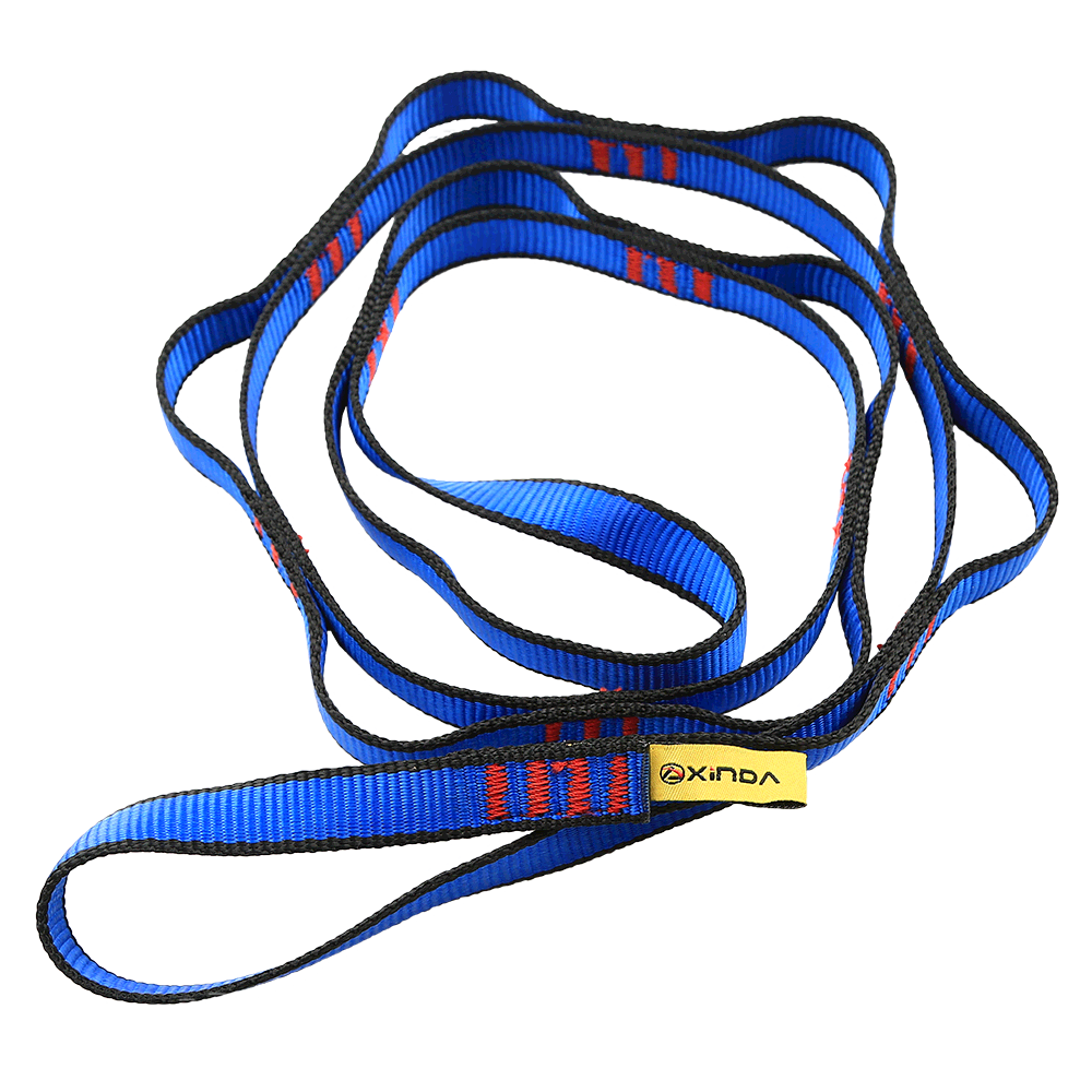 แถบเชือกแบน มีช่องคล้องเดซี่เชน แบรนด์ Xinda เป็นสลิงแบนความแข็งแรงสูงเกรดปีนเขา สามารถรับแรงดึงได้ได้สูง 2200 Kg (ปลายถึงปลาย) ส่วนแต่ละลูปจะรับน้ำหนักได้ 300 Kg