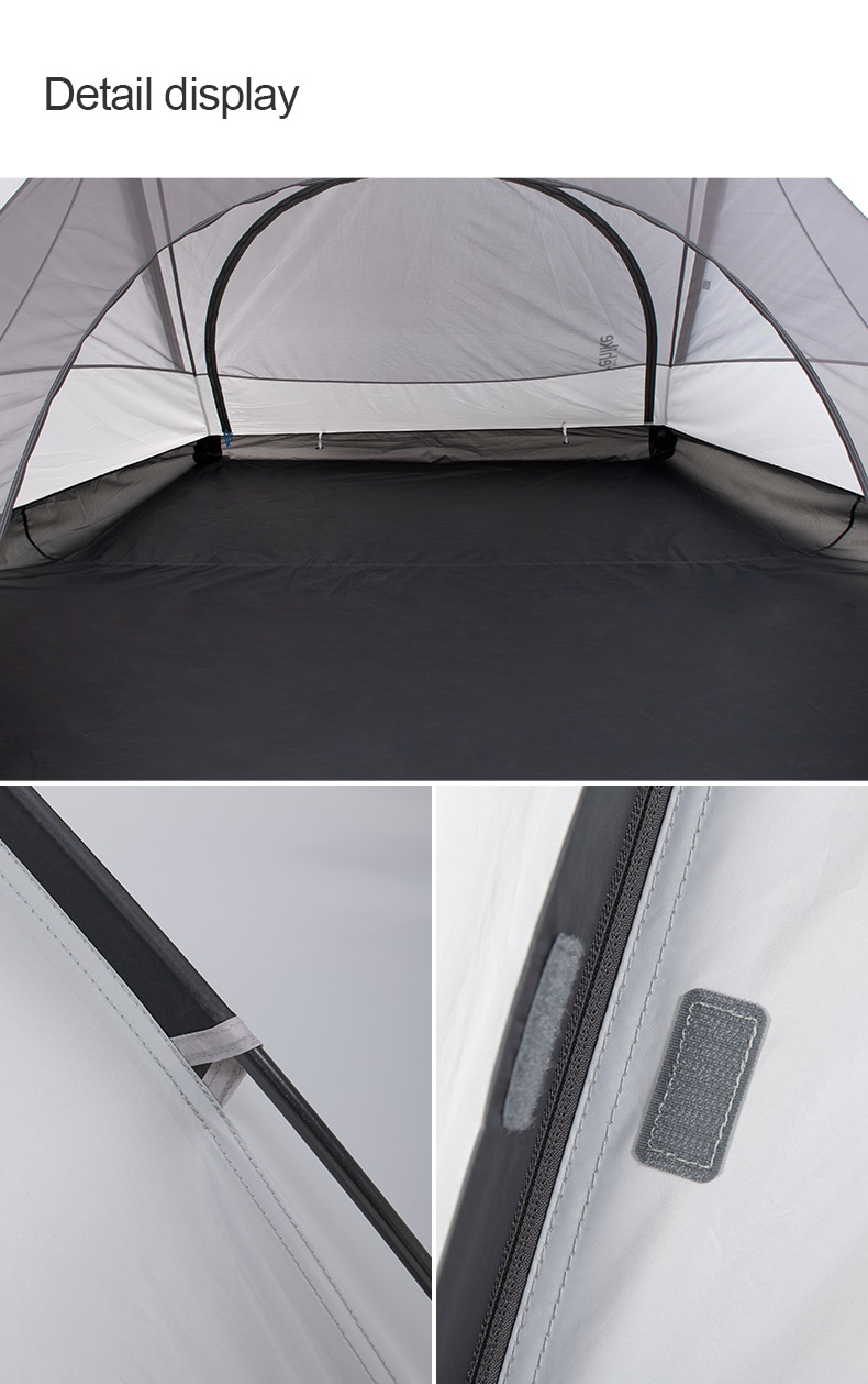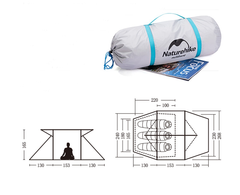 เต็นท์แบบครอบครัวที่มีห้องนั่งเล่น ขนาด 3-4 คน จาก Naturehike พื้นที่ห้องนอนส่วนหัวกว้าง 2.4 เมตร ส่วนปลายเท้ากว้าง 1.65 เมตร สูง 1.65 เมตร มีพื้นที่สำหรับนั่งเล่นและเ้ก็บของ สามารถเปิดระบายอากาศได้ทั้ง 2 ด้าน และสามารถยกขึ้นเป็นกันสาดได้ โดยใช้ไม้เท้าเดินป่า หรือเสาค้ำ (ไม่รวมในชุด)